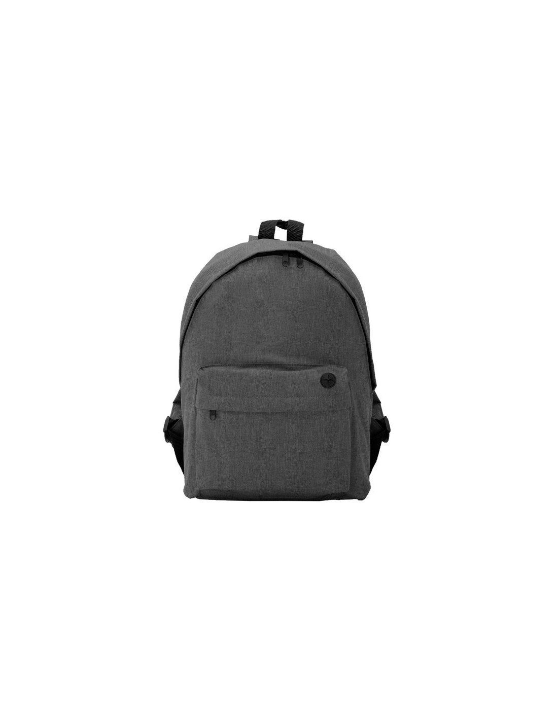 Mochila clásica de poliéster 300D con acabado jaspeado. Bolsillo frontal con salida para cables. Espalda y tirantes acolchados. Detalles en negro.