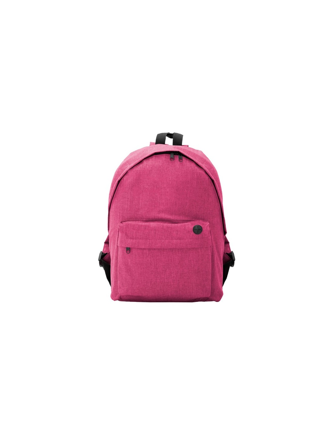 Mochila clásica de poliéster 300D con acabado jaspeado. Bolsillo frontal con salida para cables. Espalda y tirantes acolchados. Detalles en negro.