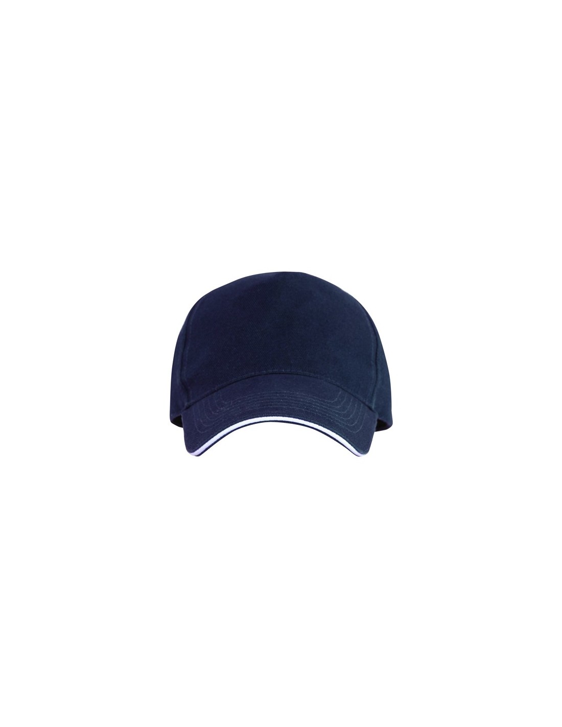 Gorra de 5 paneles con sándwich a contraste. 6 líneas de pespunte en visera. Cuatro agujeros de ventilación. Cinta interior antisudoral. Cierre de velcro.