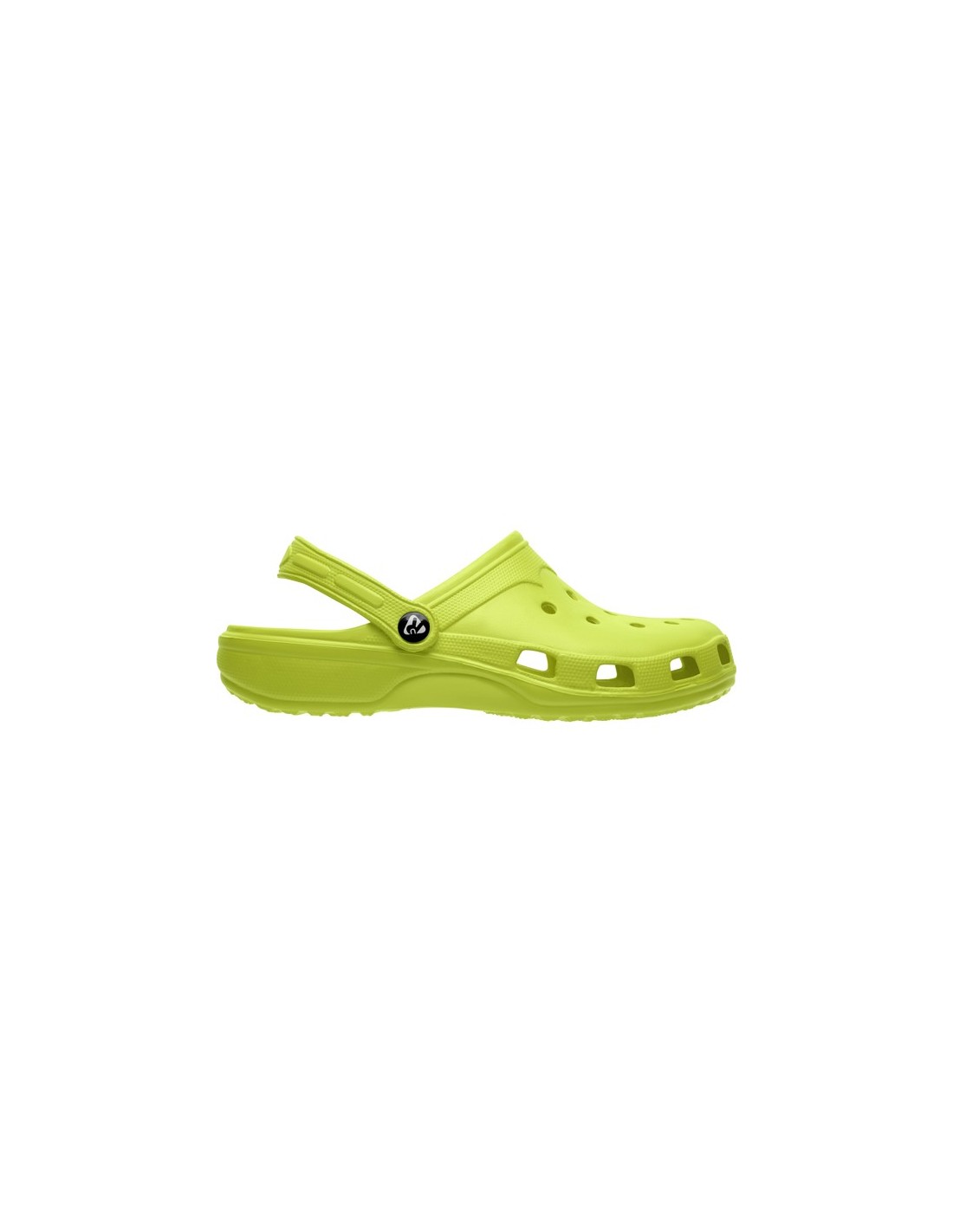 Zueco de máxima comodidad. Agujeros de ventilación y tira de sujeción de doble posición en el talón. Modelo multifuncional, para usar en tiempo libre y también ideal para personas que pasan muchas horas de pie, como trabajadores del sector alimentación, estética...