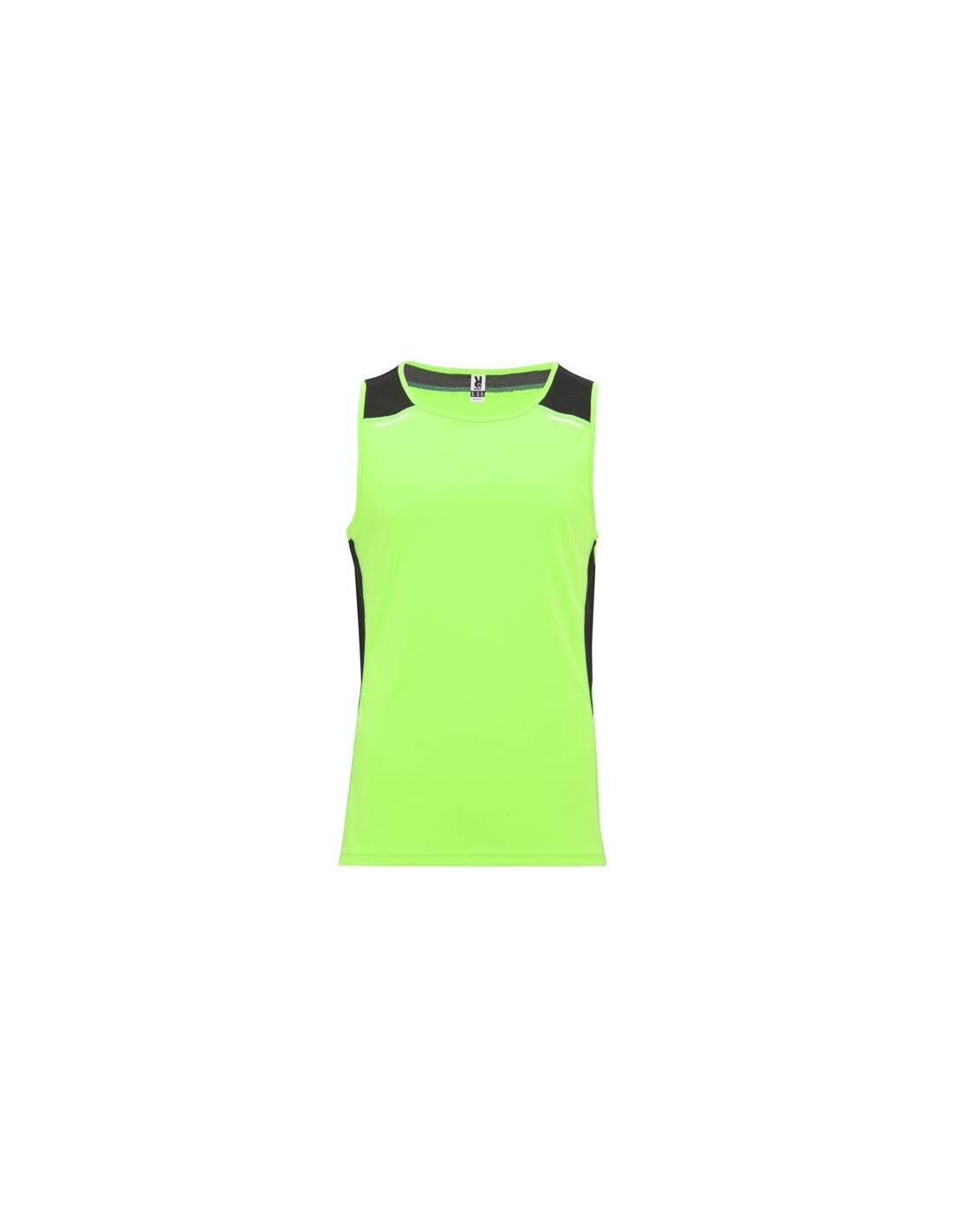 Camiseta técnica de tirantes ancho tricolor. Cuello redondo con cubre costuras de refuerzo y costuras remalladas a contraste. Tejido principal suave y fácil secado y tejido microperforado en sisas y hombros para mayor transpiración. Detalles reflectantes.