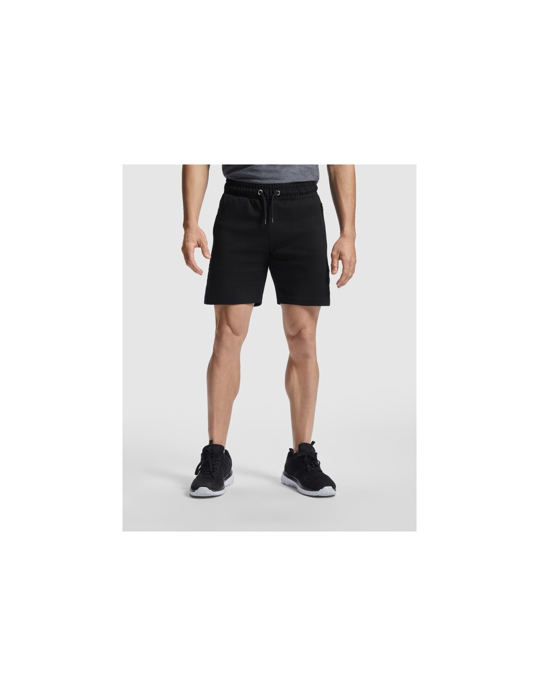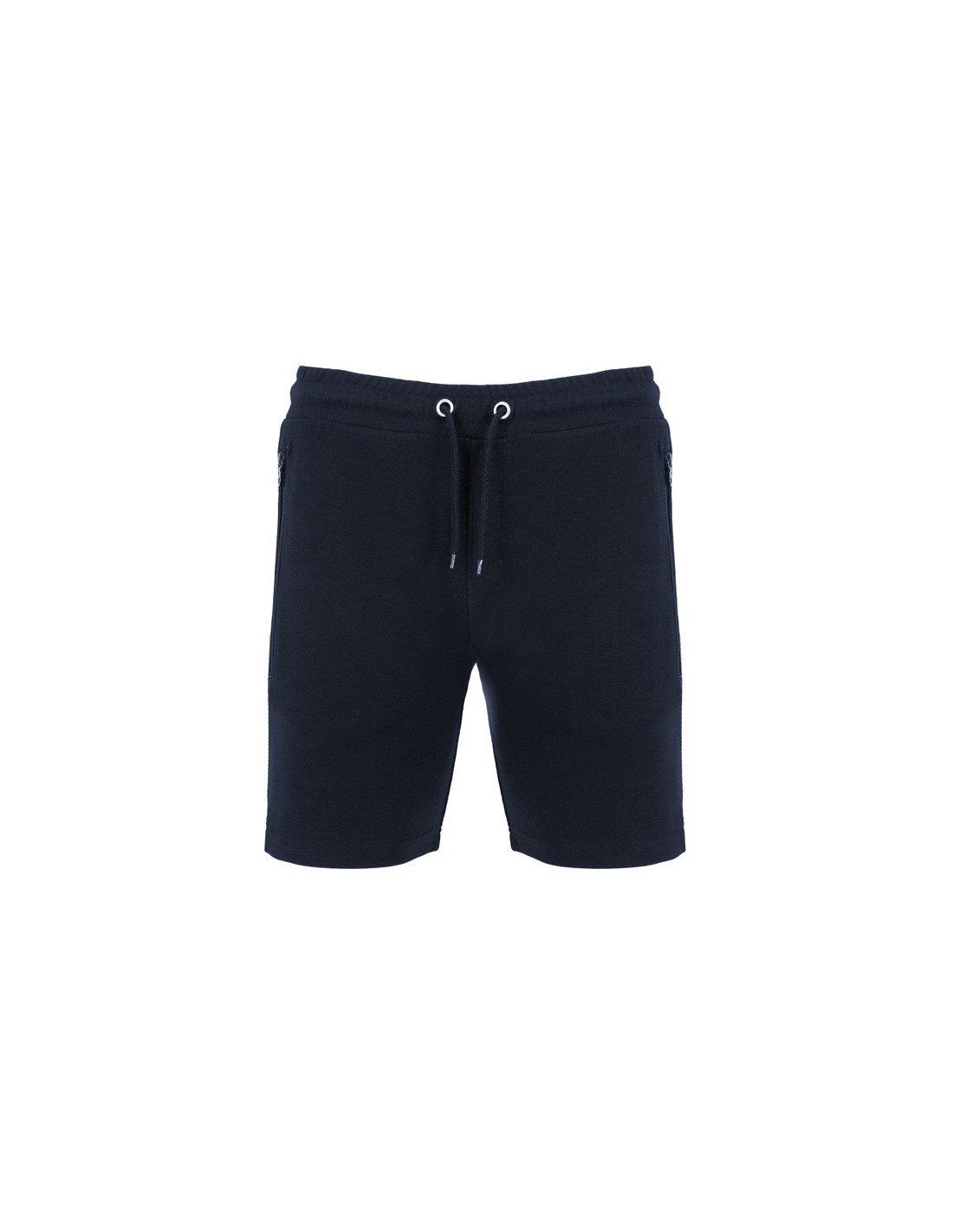 Pantalón corto con cinturilla elástica y cordón con ojales metálicos. Dos bolsillos laterales con cremalleras invertida a tono y tirador. Banda lateral a tono. Adorno de bragueta cosida. Un bolsillo trasero con broche de presión.