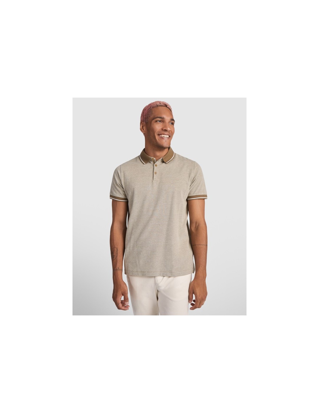 Polo Vigoré de manga corta. Cuello y bocamangas en color solido con canalé 1x1 y detalle decorativo a contraste. Tapeta interior con cinta decorativa a contraste y tres botones. Bajo con apertura lateral reforzada y cinta decorativa. Espalda ligeramente más larga que el delantero.