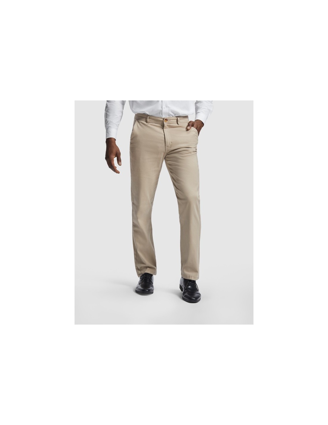 Pantalón largo de hombre con tejido resistente y confortable. · Trabillas para cinturón. · Dos bolsillos laterales de corte oblicuo tipo "chino". · Dos bolsillos traseros de ojal con botón y costura de adorno. · Pinzas traseras. · Especial para hostelería y ámbito laboral.