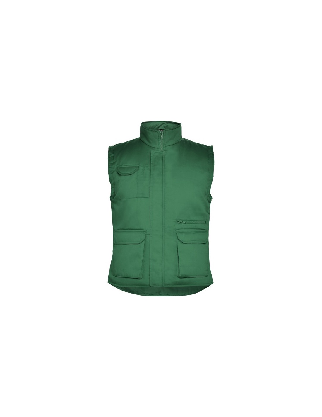 Chaleco laboral multibolsillos con cuello alto. · Cremallera central con trabilla y velcro. · Un bolsillo exterior para móvil en lado derecho. · Dos bolsillos frontales con fuelle y aberturas laterales. · Dos depósitos para bolígrafos. · Un bolsillo interior con velcro. · Bolsillo cremallera. · Bolsillo interior con velcro. · Bajo posterior con faldón. · Ajustador con cierre automático.