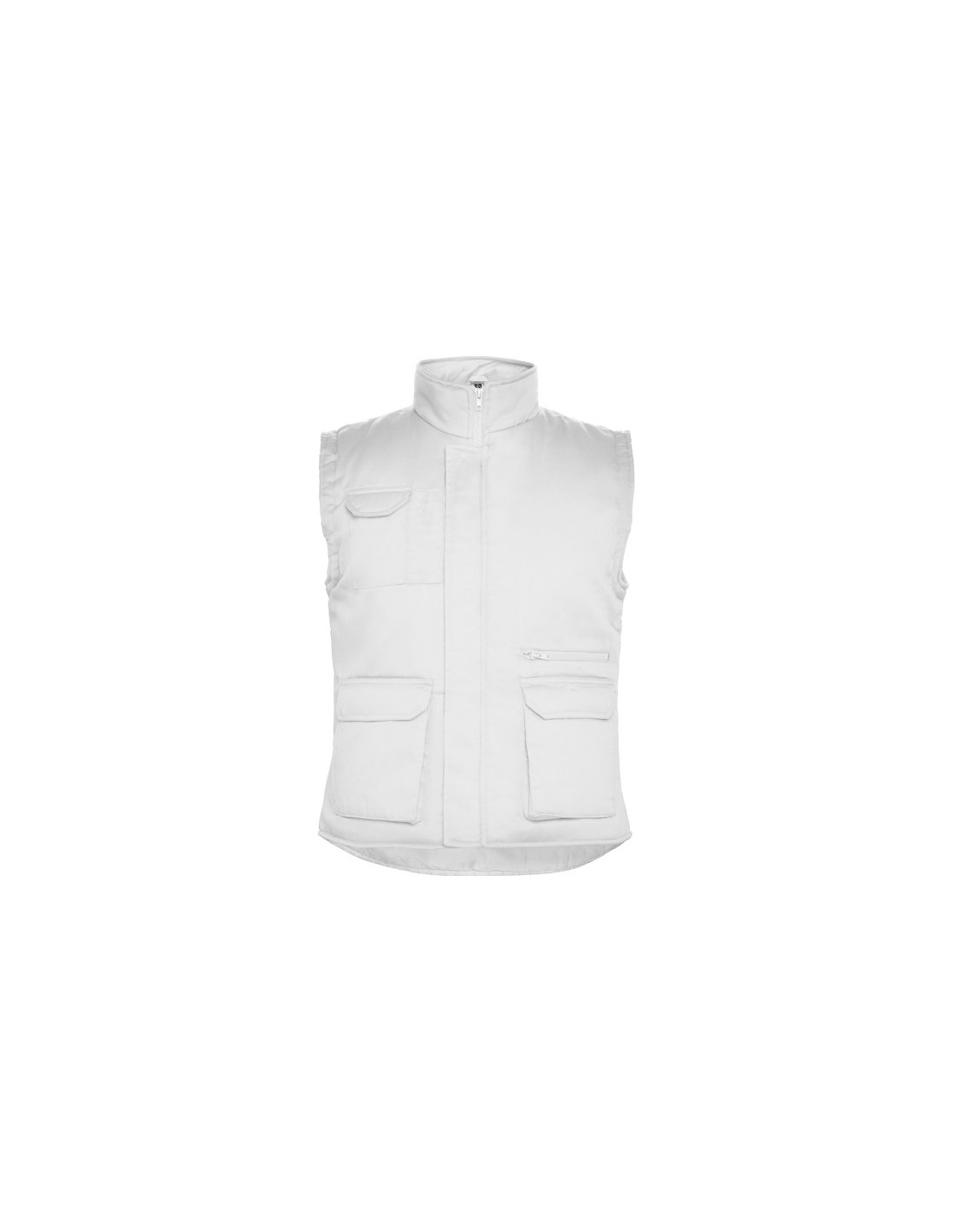 Chaleco laboral multibolsillos con cuello alto. · Cremallera central con trabilla y velcro. · Un bolsillo exterior para móvil en lado derecho. · Dos bolsillos frontales con fuelle y aberturas laterales. · Dos depósitos para bolígrafos. · Un bolsillo interior con velcro. · Bolsillo cremallera. · Bolsillo interior con velcro. · Bajo posterior con faldón. · Ajustador con cierre automático.