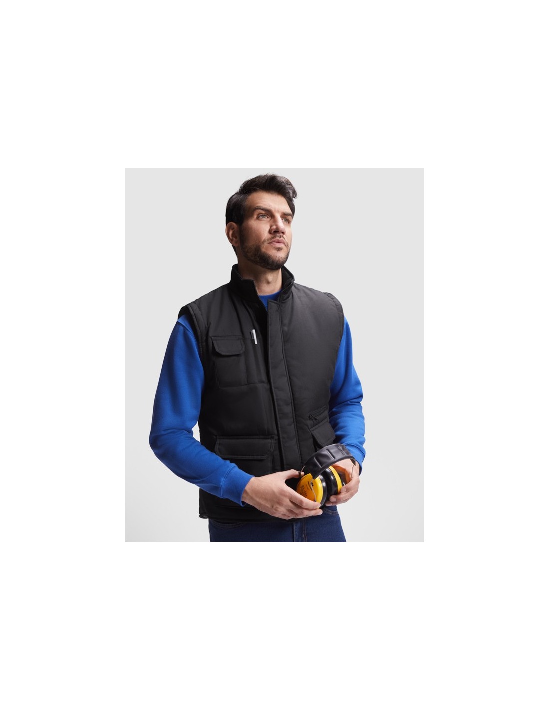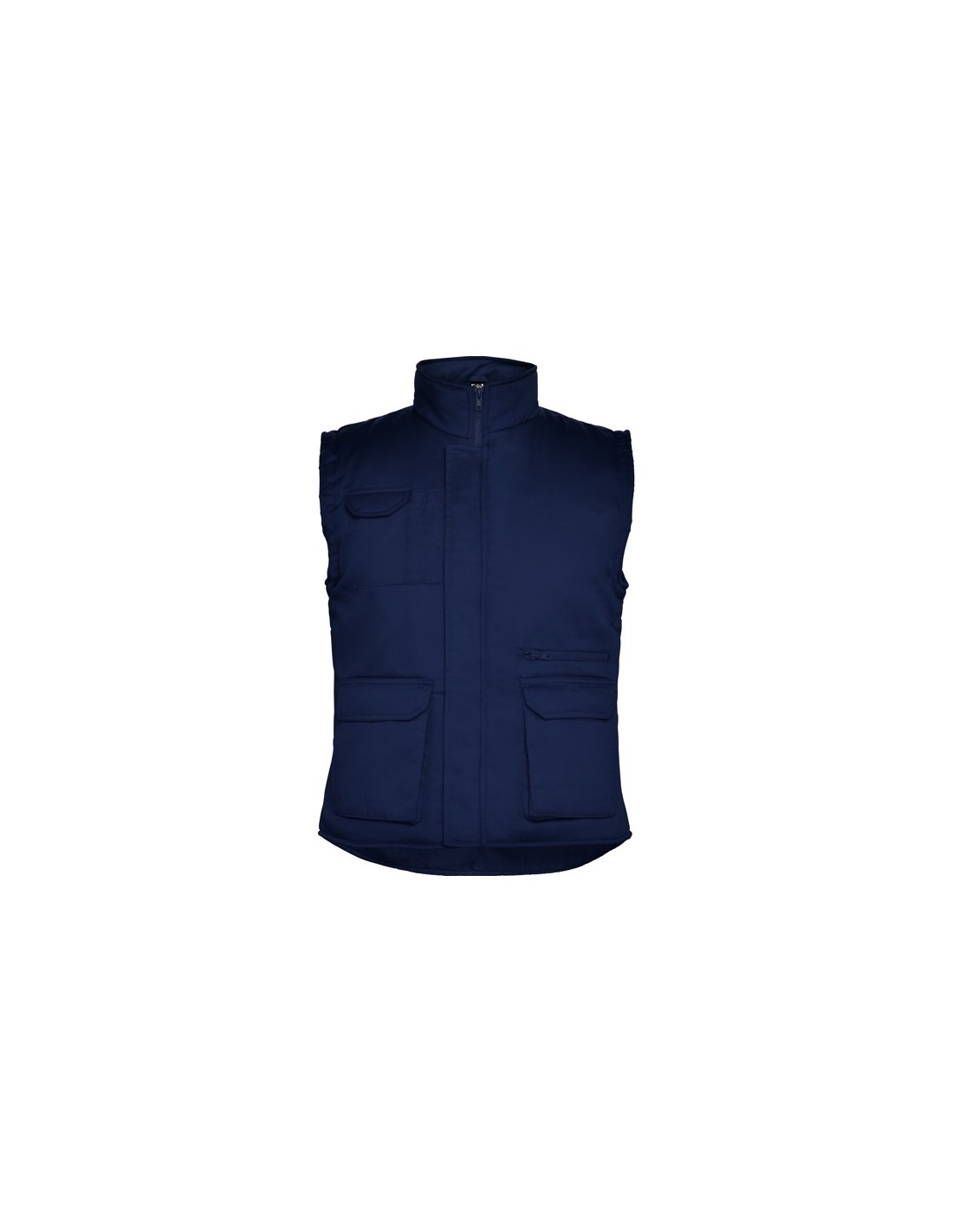 Chaleco laboral multibolsillos con cuello alto. · Cremallera central con trabilla y velcro. · Un bolsillo exterior para móvil en lado derecho. · Dos bolsillos frontales con fuelle y aberturas laterales. · Dos depósitos para bolígrafos. · Un bolsillo interior con velcro. · Bolsillo cremallera. · Bolsillo interior con velcro. · Bajo posterior con faldón. · Ajustador con cierre automático.