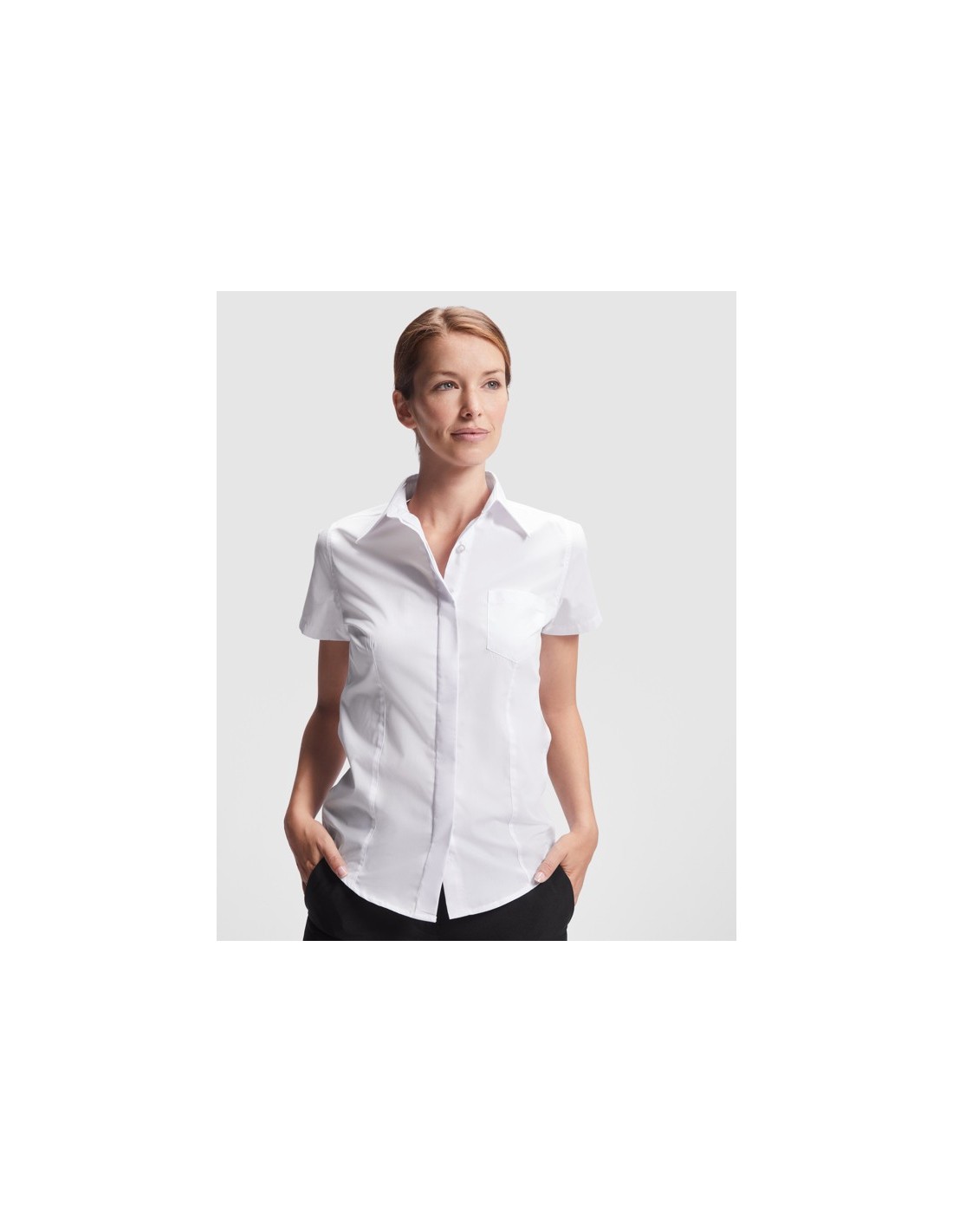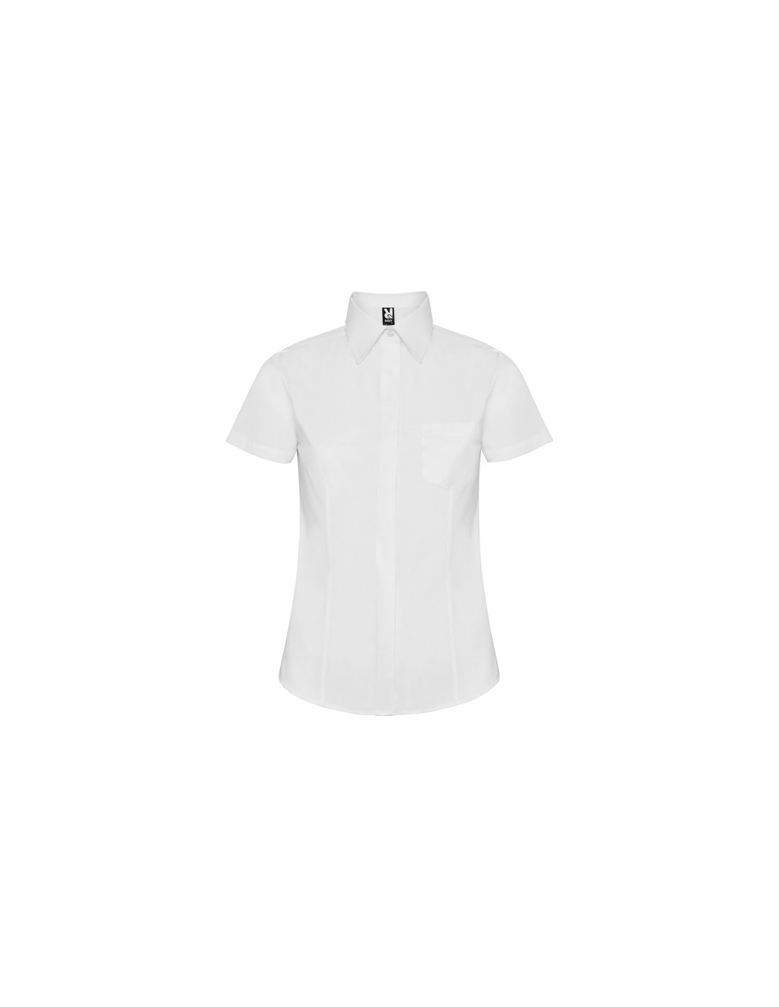 Camisa de manga corta entallada de mujer. · Pinzas en delantero y espalda. · Bolsillo frontal izquierdo y tapeta cubre botones. · Bajo redondeado. · Cuidado fácil.