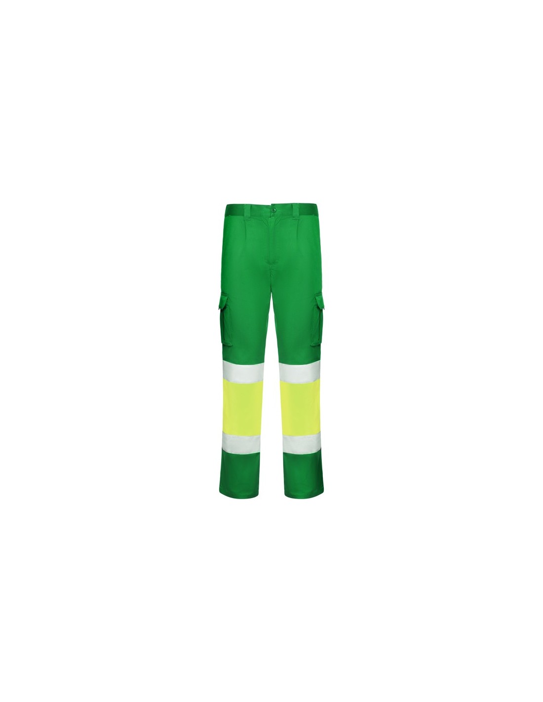 Pantalón largo multibolsillos de alta visibilidad. · Tejido cómodo y flexible. · Cintura ajustable elástica en la parte trasera. · Dos bolsillos frontales. · Dos bolsillos traseros con tapeta y cierre de velcro. · Dos bolsillos laterales de fuelle con tapeta y cierre de velcro. · Combinado en dos colores y cintas reflectantes horizontales.