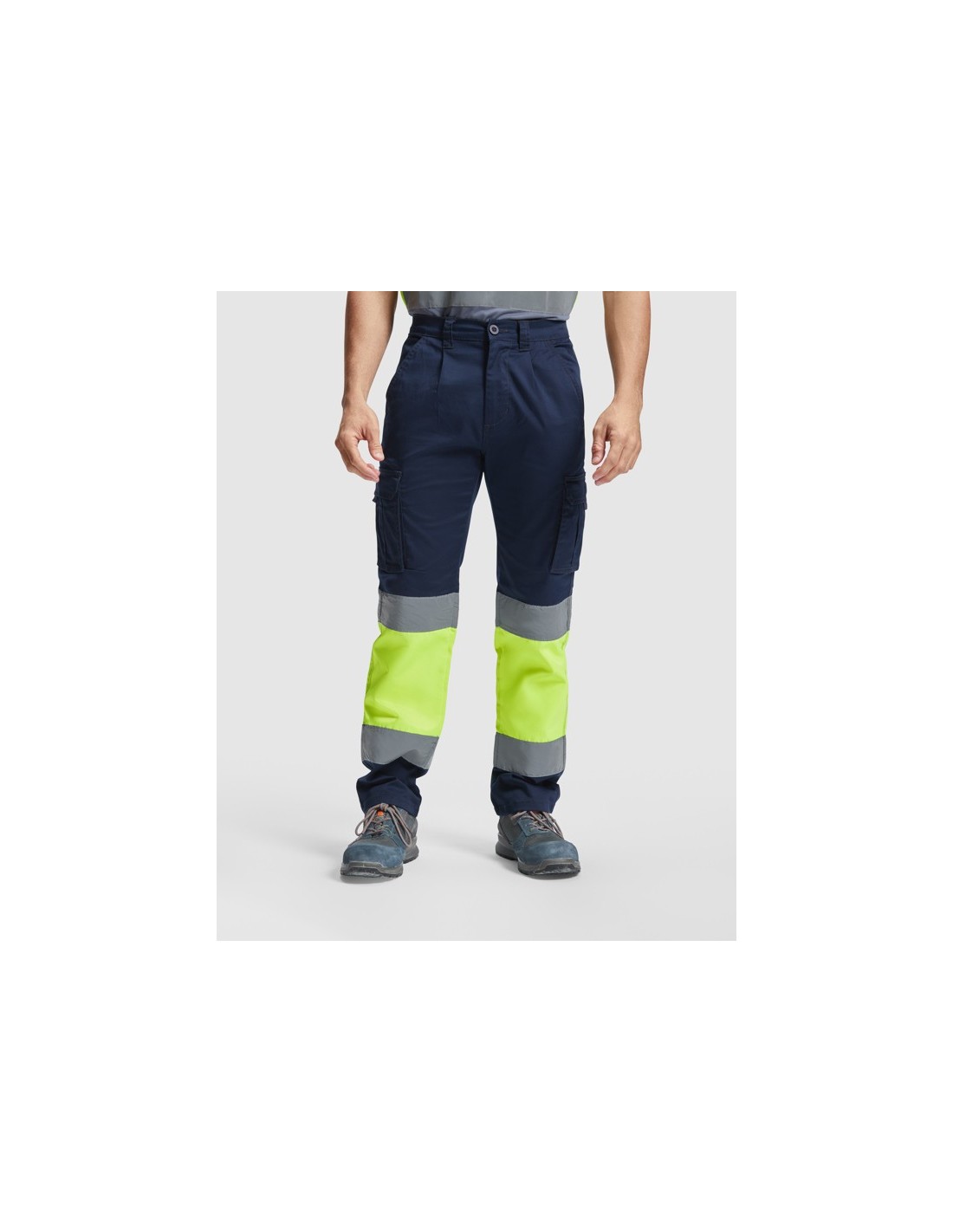 Pantalón largo multibolsillos de alta visibilidad. · Tejido cómodo y flexible. · Cintura ajustable elástica en la parte trasera. · Dos bolsillos frontales. · Dos bolsillos traseros con tapeta y cierre de velcro. · Dos bolsillos laterales de fuelle con tapeta y cierre de velcro. · Combinado en dos colores y cintas reflectantes horizontales.