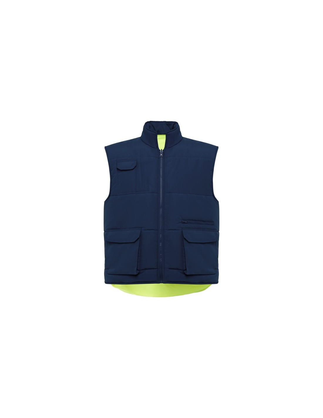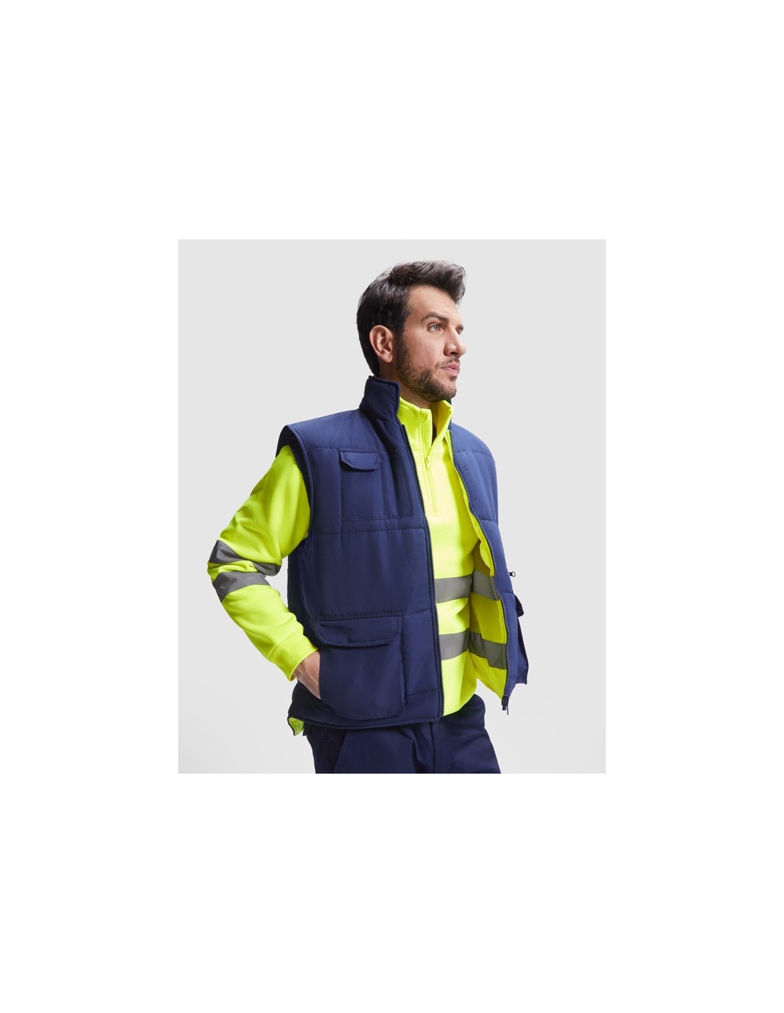 Chaleco reversible multibolsillos y alta visibilidad, con cuello alto.