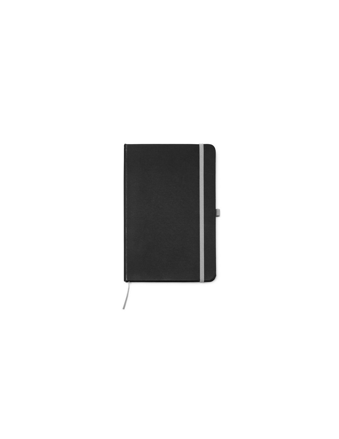 Bloc de notas A5 con tapa rígida de PU negro. Marcapáginas, banda elástica de cierre y soporte para bolígrafo a color. Cuenta con 80 hojas rayadas.