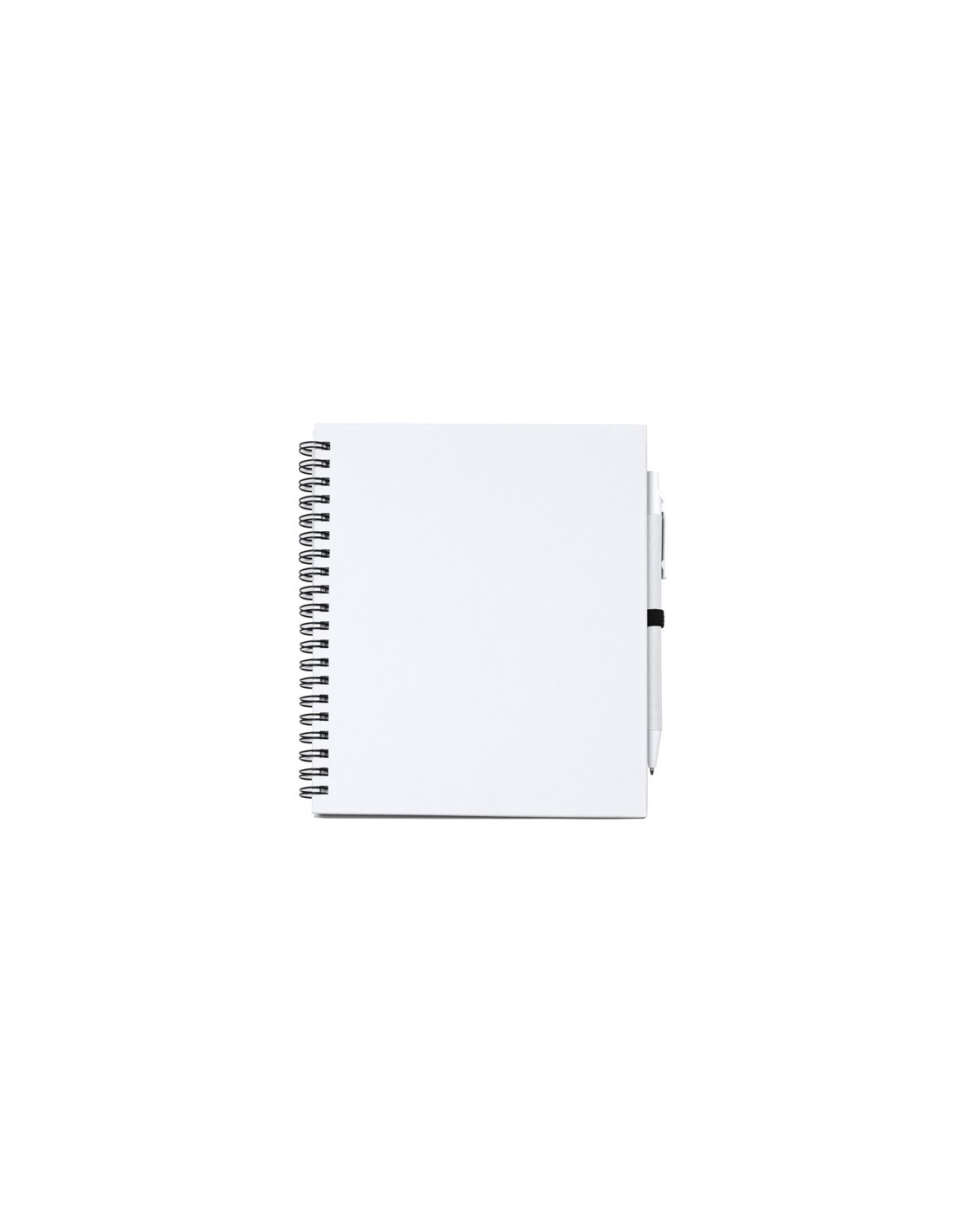 Libreta con espiral, compuesta por 70 hojas de papel liso y soporte para bolígrafo. Tapas rígidas y bolígrafo de cartón reciclado a juego. Observaciones: Libreta compuesta por 70 hojas