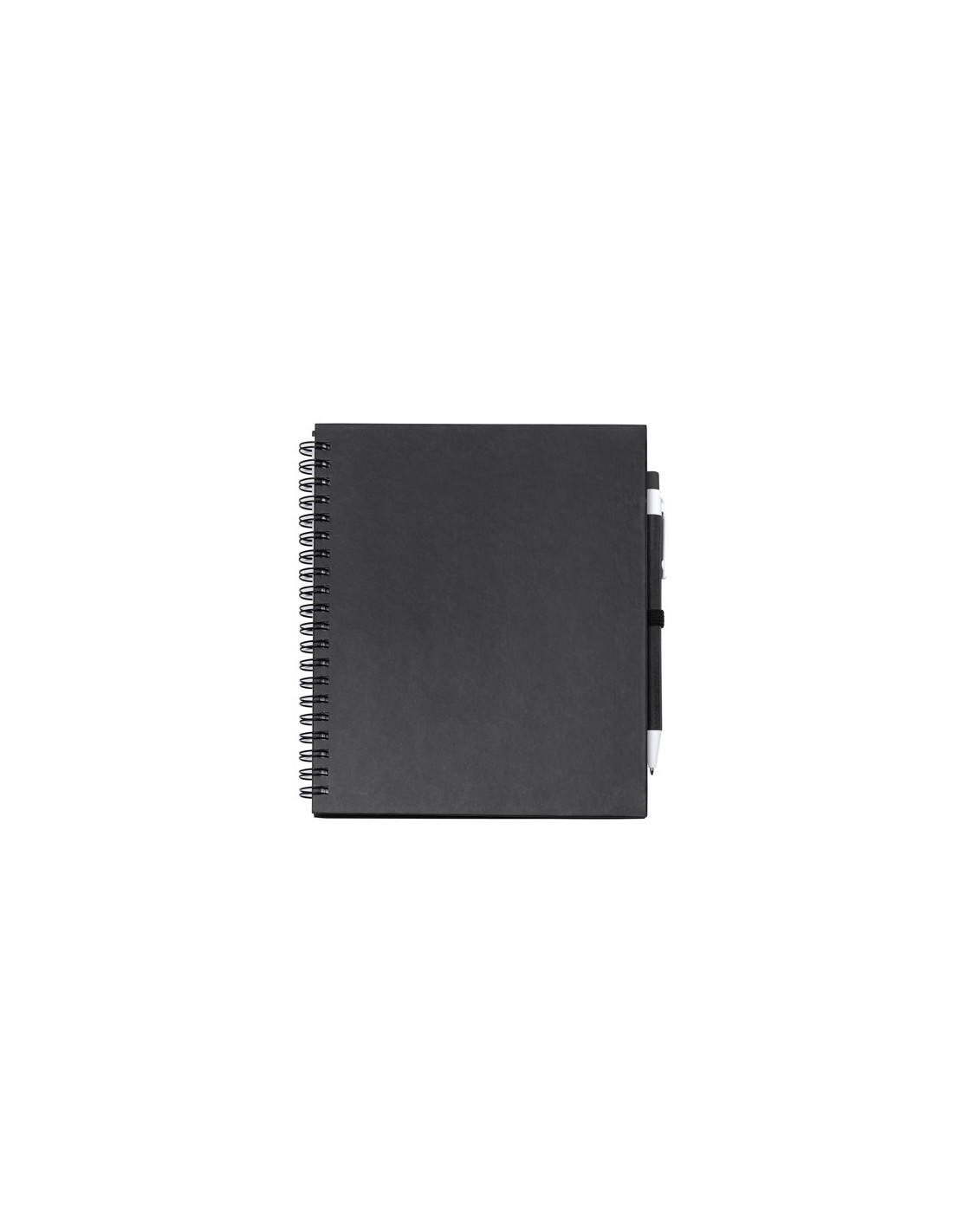 Libreta con espiral, compuesta por 70 hojas de papel liso y soporte para bolígrafo. Tapas rígidas y bolígrafo de cartón reciclado a juego. Observaciones: Libreta compuesta por 70 hojas