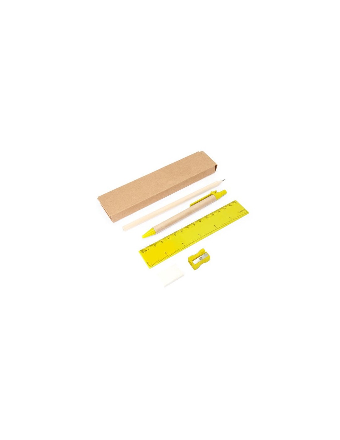 Set de 5 piezas. Incluye bolígrafo con cuerpo de cartón y tinta azul, lápiz de madera, sacapuntas, goma y regla de 15 cm.