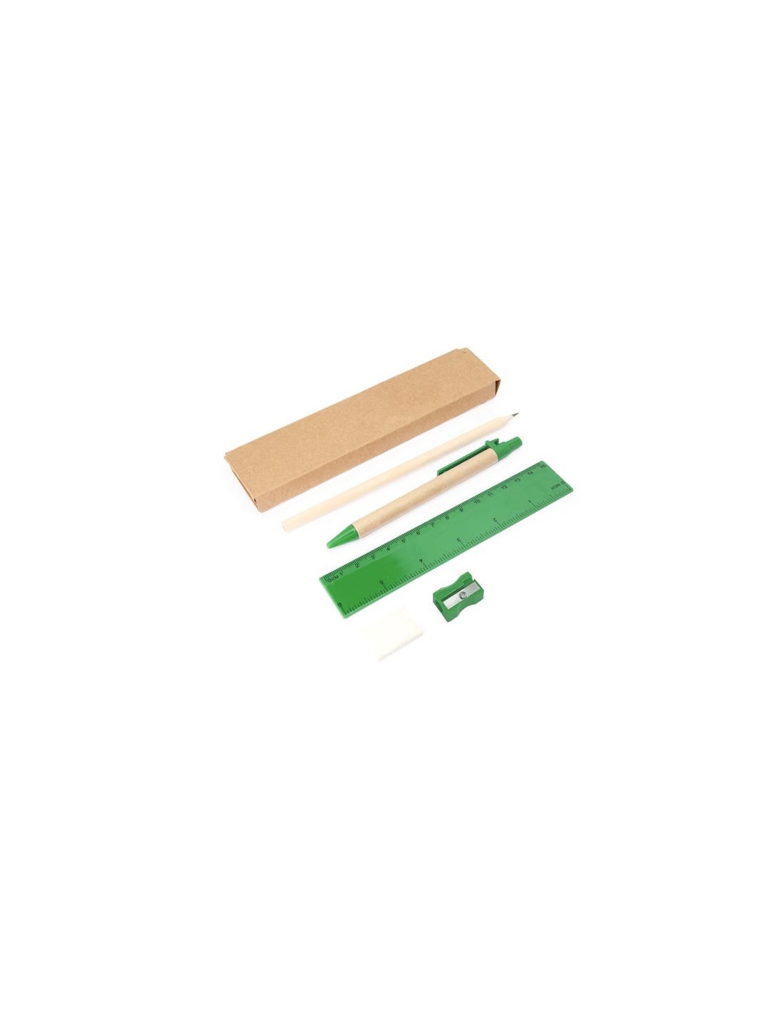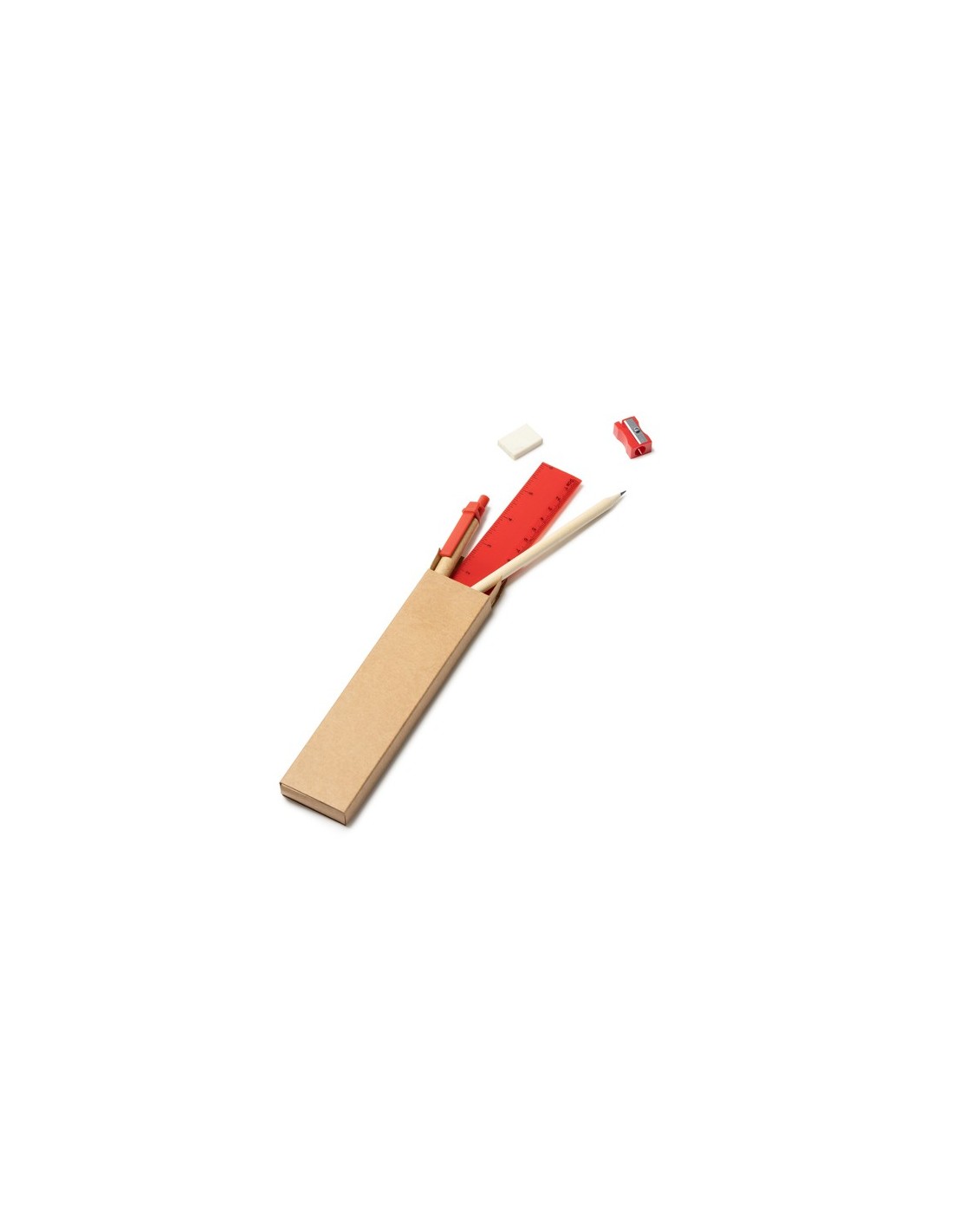 Set de 5 piezas. Incluye bolígrafo con cuerpo de cartón y tinta azul, lápiz de madera, sacapuntas, goma y regla de 15 cm.