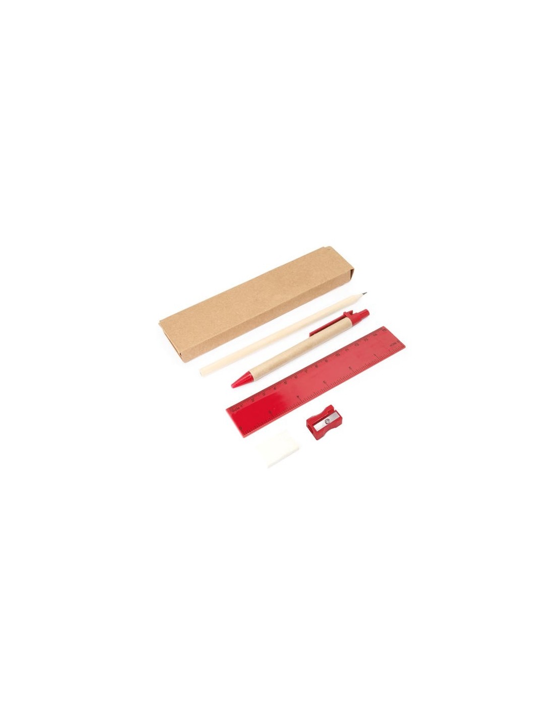 Set de 5 piezas. Incluye bolígrafo con cuerpo de cartón y tinta azul, lápiz de madera, sacapuntas, goma y regla de 15 cm.